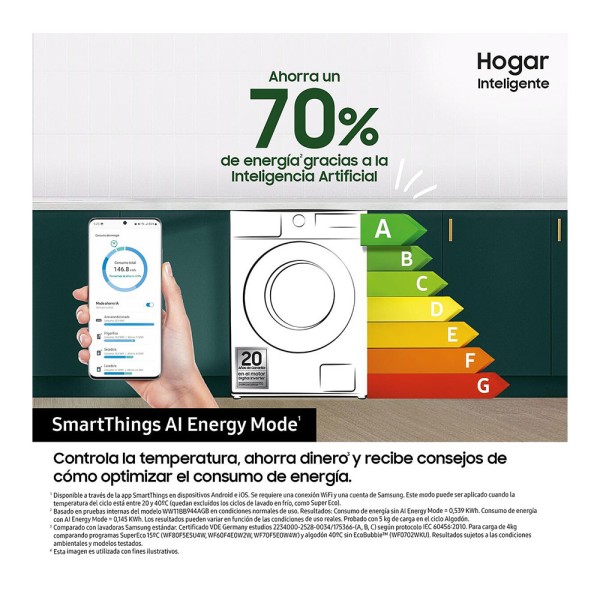 Disfruta de un lavado eficiente y sin complicaciones con la aplicación SmartThings[4]. AI Energy Mode te ayuda a gestionar el uso de energía, y el modo 'Home Care' mantiene la lavadora en las mejores condiciones. Además, si tienes una secadora en casa puedes emparejarla con tu lavadora.